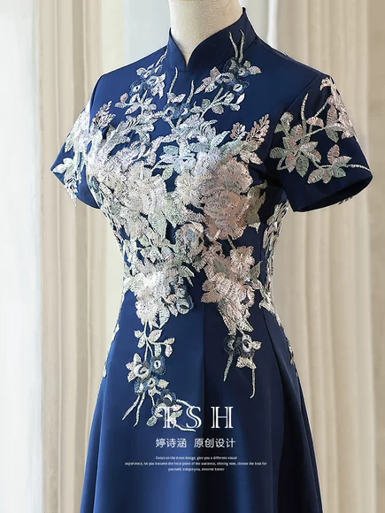 Cheongsam biru, busana bergaya Tiongkok modern yang dimodifikasi agar tampak awet muda, memancarkan keanggunan dan kecanggihan, gaun malam bergaya Tiongkok kelas atas untuk pertemuan tahunan wanita. quantity