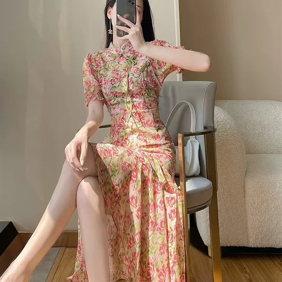 Cheongsam Cina bergaya Eropa, koleksi musim panas 2025 terbaru, gaun ekor ikan elegan kelas atas dengan motif bunga merah muda yang disempurnakan.