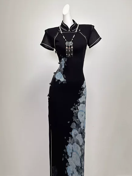 Cheongsam hitam, gaya Tiongkok baru, motif bunga besar, gaya musim panas baru 2025, sangat cantik, mewah, elegan, dan berkelas. quantity