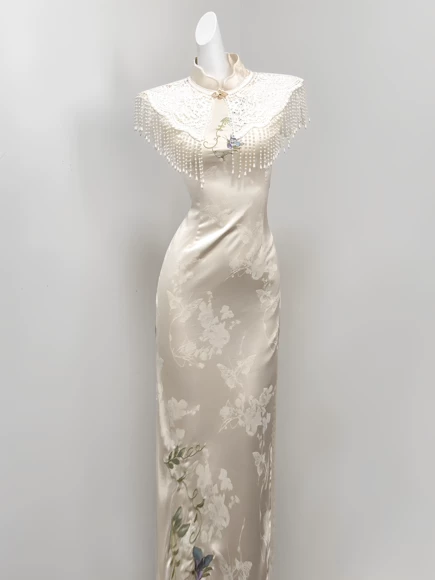 Cheongsam satin putih kelas atas, elegan, dan mewah, model baru 2025, gaun pertunangan bergaya Tiongkok dengan bahu seperti awan yang indah, ringan untuk musim panas. quantity