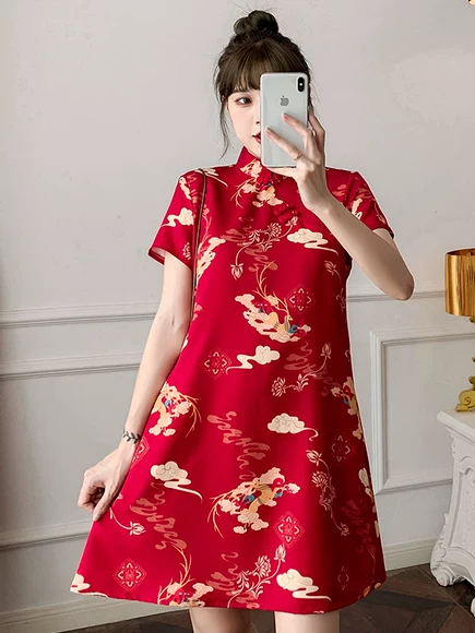 Cheongsam merah modern dan trendi untuk wanita, sempurna untuk wanita bertubuh mungil, gaya baru untuk tahun 2025, awet muda dan cocok untuk dipakai sehari-hari, pasti akan menarik perhatian.