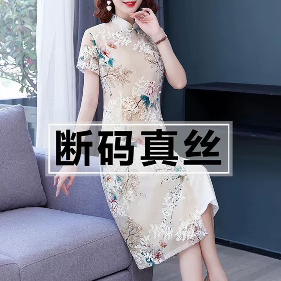 Gaun Sutra Wanita Merek Hangzhou, Cheongsam Modifikasi, Pakaian Musim Panas untuk Ibu-ibu Paruh Baya, Gaya Cina yang Elegan dan Tradisional, Gaun Sutra Mulberry