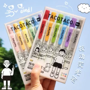 Pulpen stabilo tekan tombol Taco dilengkapi dengan enam spidol warna Morandi untuk menandai kesalahan, membuat garis besar, dan menekankan poin-poin penting.