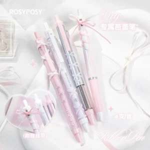 Pulpen Latihan Fleksibel Gaya Balet RosyPosy dengan Pita Tali, Pulpen Gel Hitam 0,5mm Empat Buah, Ramah untuk Pelajar, Gaya Instagram, Diaktifkan dengan Tekan