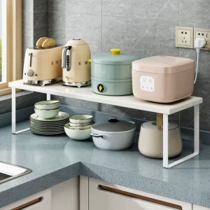 Rak di atas meja dapur, rak bertingkat untuk piring dan bumbu di dalam lemari.