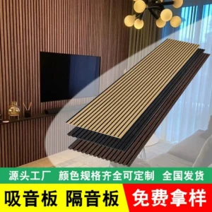 Papan peredam suara kisi-kisi bertekstur MDF untuk perdagangan luar negeri, papan insulasi suara serat poliester, dinding latar, dekorasi ruang tamu, papan peredam suara strip kayu.