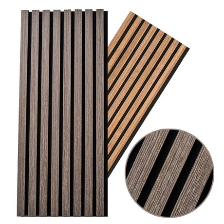 Panel peredam suara berbahan serat poliester berbentuk strip kayu untuk ruang tamu, home theater, dan auditorium.