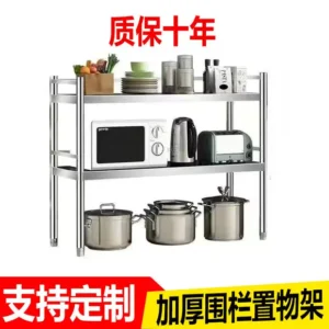 Rak penyimpanan dapur dari baja tahan karat tebal, dua atau tiga tingkat, rak oven microwave, rak panci, rak bumbu, rak penyimpanan berdiri di lantai.